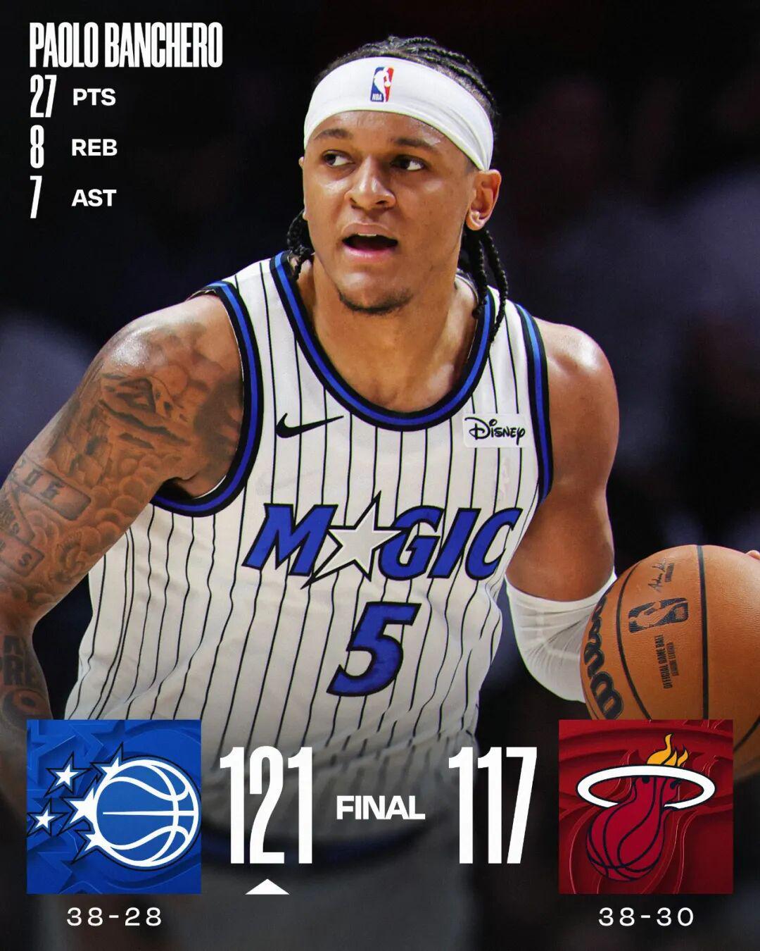 魔术121-117击败热火,拿下本赛季第五次胜利。