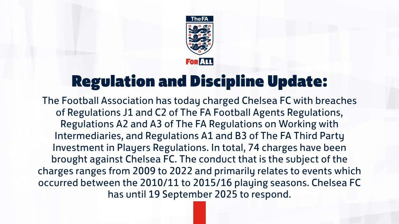 今日指控切尔西足球俱乐部违反了《英足总足球经纪人规章》J1和C2条、《英足总关于与中介机构合作的规章》A2和A3条以及《英足总第三方球员投资规章》A1和B3条。